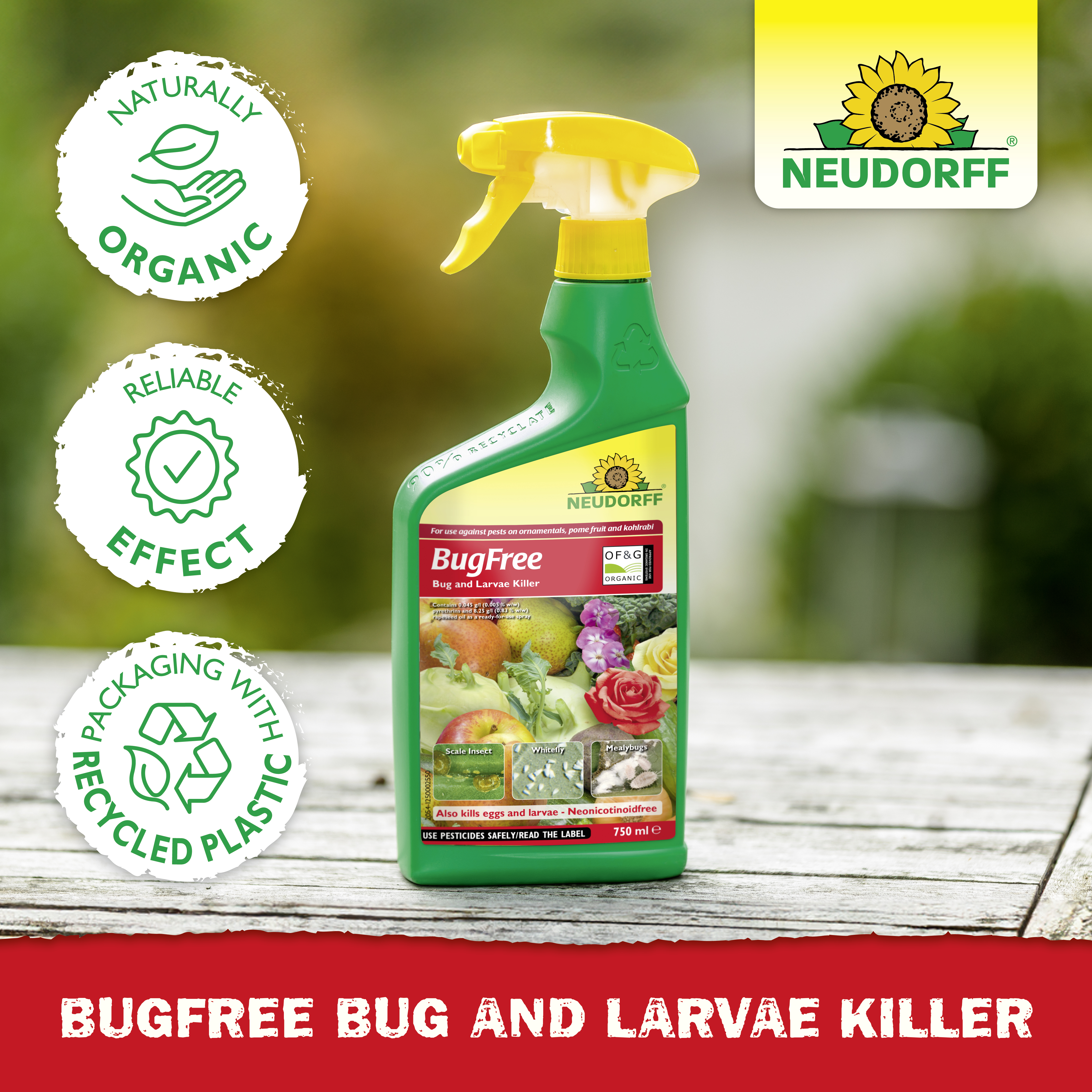 The unique formulation of BugFree Bug & Larvae Killer* controls a wide range of harmful pests including aphids, whitefly, greenfly, spider mites, mealy bugs, scale insects, leaf hoppers and thrips. It also acts on the eggs and larvae of the insects to provide extended periods of control. Contains the naturally derived active ingredient Pyrethrins. This active ingredient is derived from the chrysanthemum flower (Chrysanthemum cinerariaefolium) which is native to the Kenyan highlands. Neudorff ensures that all pyrethrum used in their products is responsibly sourced and have been using natural pyrethrum in the Neudorff range since 1861. Due to the pyrethrum’s rapid breakdown there only needs to be a short waiting period prior to harvest when used on edible fruit.