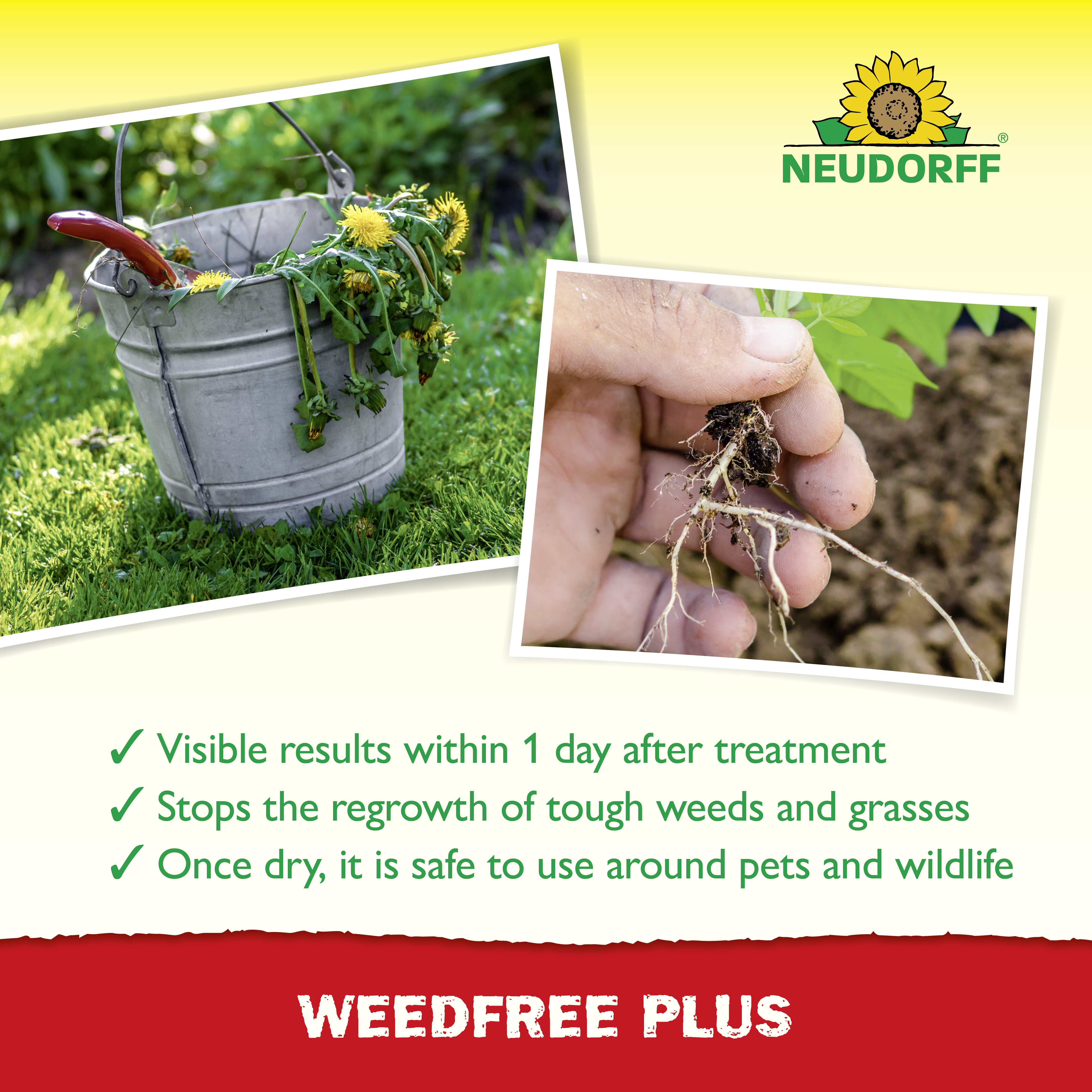 - Visible results for weeds (e.g. goutweed) and grasses within 1 day after treatment